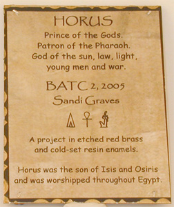 In 2005, I decided to continue the Egyptian Theme once again, and also continue etching brass for my media. This time I wanted to try and make the imagery more vivid by using resin enamels. I used Colores resin enamels for the coloring with a 20-minute epoxy hardener. I wanted to approximate the wall paintings of the Egyptian deities. The rules of the BATCs are that at least one bead must be used for each project. I filled those requirements, but didn't do the extensive beading that I did on the first BATC.