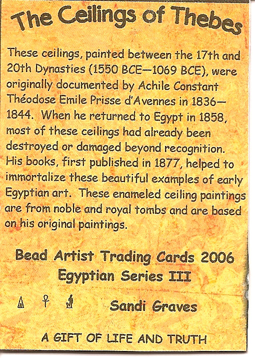 In 2004 I was a participant in the first Bead Artist Trading Cards swap, organized by friends of mine on the All About Beads chat list on Yahoo Groups. I had been playing with etching brass, and decided to etch red brass with Egyptian symbols and hieroglyphics taken from a burial sarcophagus - a prayer for the deceased to the Gods. I then hand drilled holes around the central image and wired seed beads into the outlines. Then, deciding that the cards were still not quite decorative enough, I drilled around the card borders and wired seed beads onto the borders. I was a bit obsessed about making these spectacular. I was very happy with the results and it started me on a quest to improve my etched images.